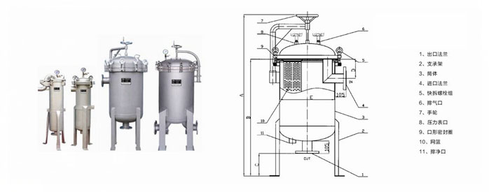 袋式過濾機(jī)是一種壓力式過濾裝置,主要有過濾筒體、過濾筒蓋和快開機(jī)構(gòu)、不銹鋼濾袋加強(qiáng)網(wǎng)等主要部件組成,濾液由過濾機(jī)外殼的旁側(cè)入口管流入濾袋,濾袋本身是裝置在加強(qiáng)網(wǎng)籃內(nèi),液體滲透過所需要細(xì)度等級的濾袋即能獲得合格的濾液,雜質(zhì)顆粒被濾袋攔截。該機(jī)更換濾袋十分方便,過濾基本無物料消耗。